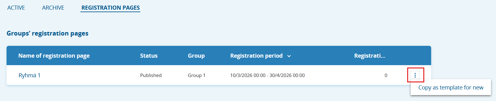 - To use an old registration page as a template, go to the Registration Pages tab and, as shown in the image below, click the menu button.