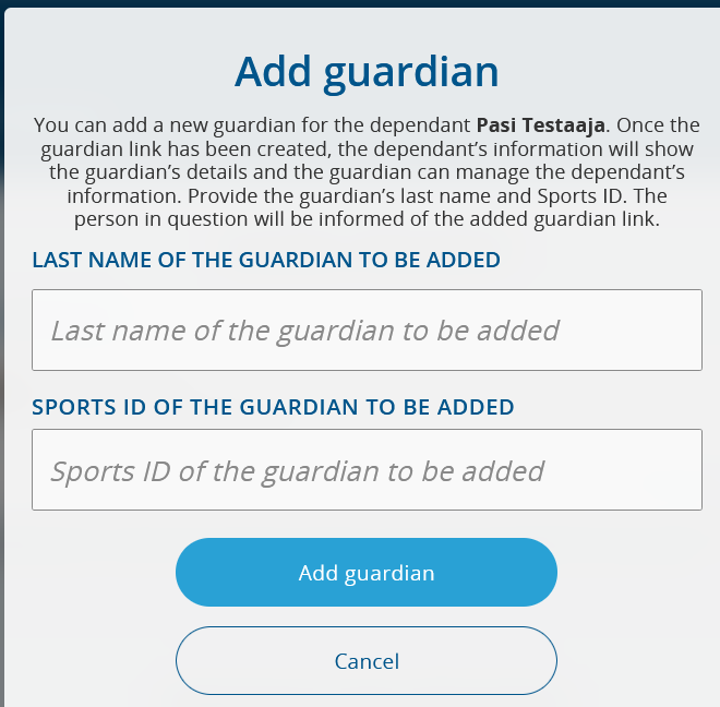 For security reasons, a second guardian link can be created either by the first guardian or by Suomisport Customer Support.