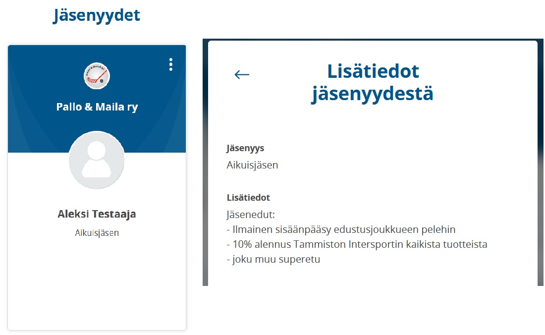 Kuva: Jäsenkortti Suomisport-sovelluksessa ja sen kääntöpuolella näkyvistä lisätiedoista kirjattu seuran etuja.