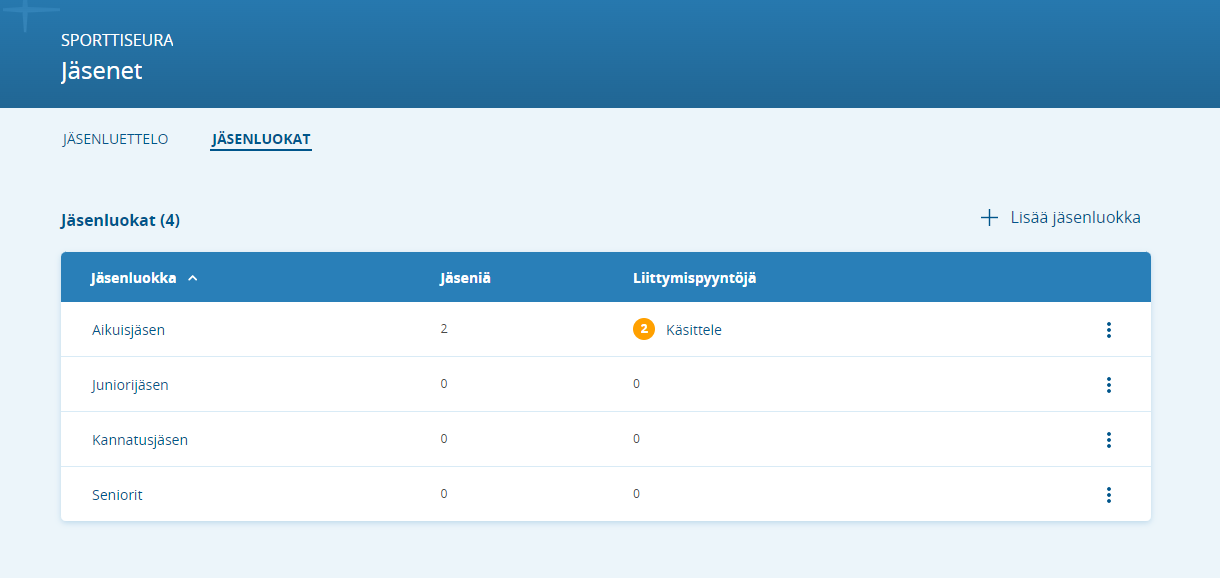 3. Luo seuran sääntöjen mukaiset jäsenluokat yksitellen palveluun Luo uusi jäsenluokka -painikkeesta.