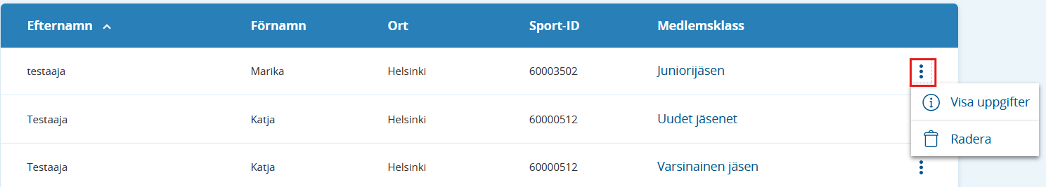 - En medlem kan inte själv lämna en medlemsklass. Endast föreningsadministratören kan ta bort medlemmar. Medlemmar kan tas bort antingen från en medlemsklass eller direkt från sidan "Medlemsregister".