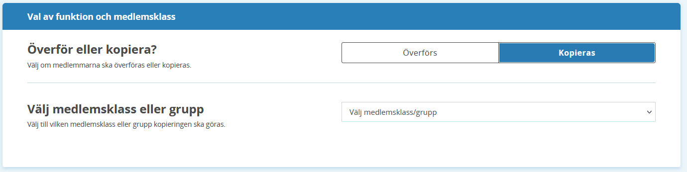 Du kan flytta medlemmar till en annan medlemsklass eller kopiera medlemmar till en annan medlemsklass eller grupp. Observera att flyttfunktionen endast fungerar mellan medlemsklasser.